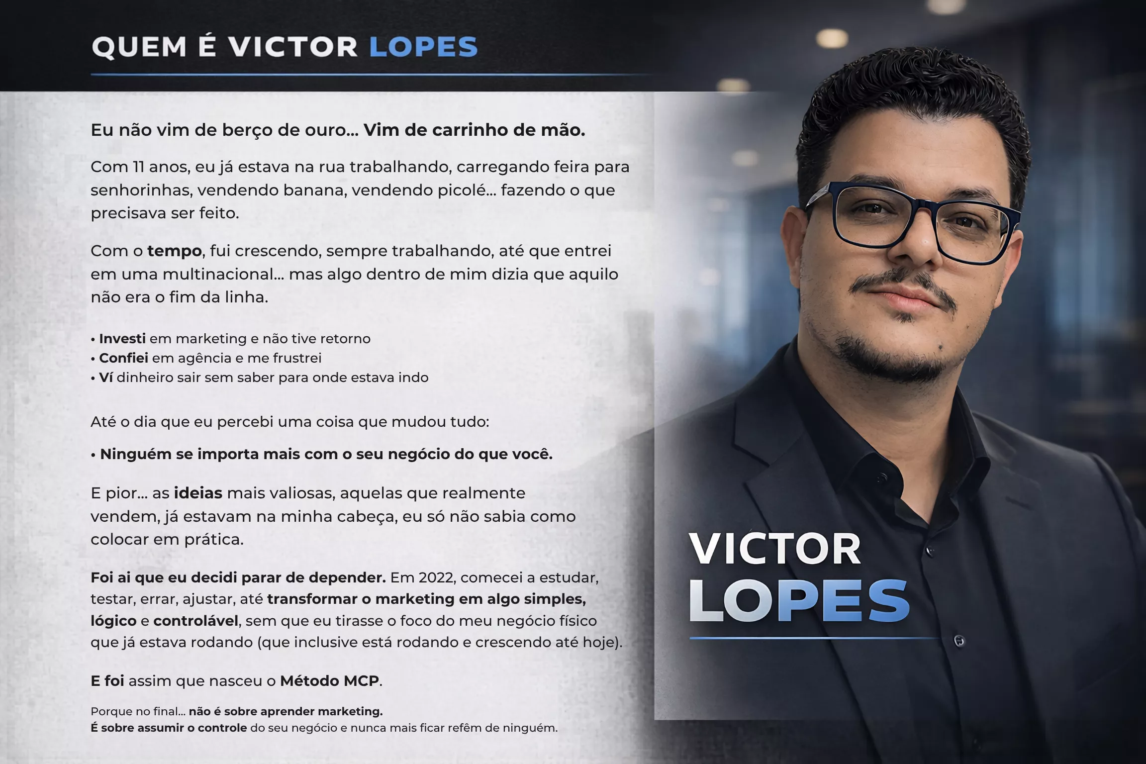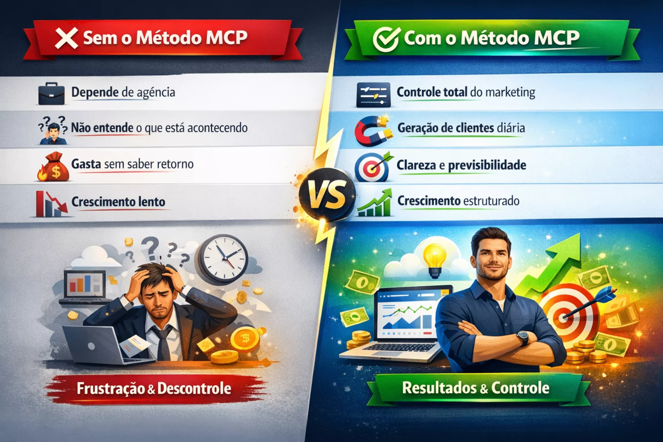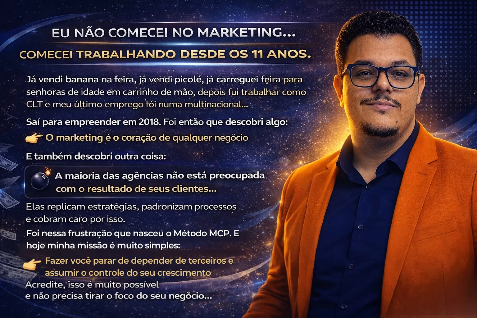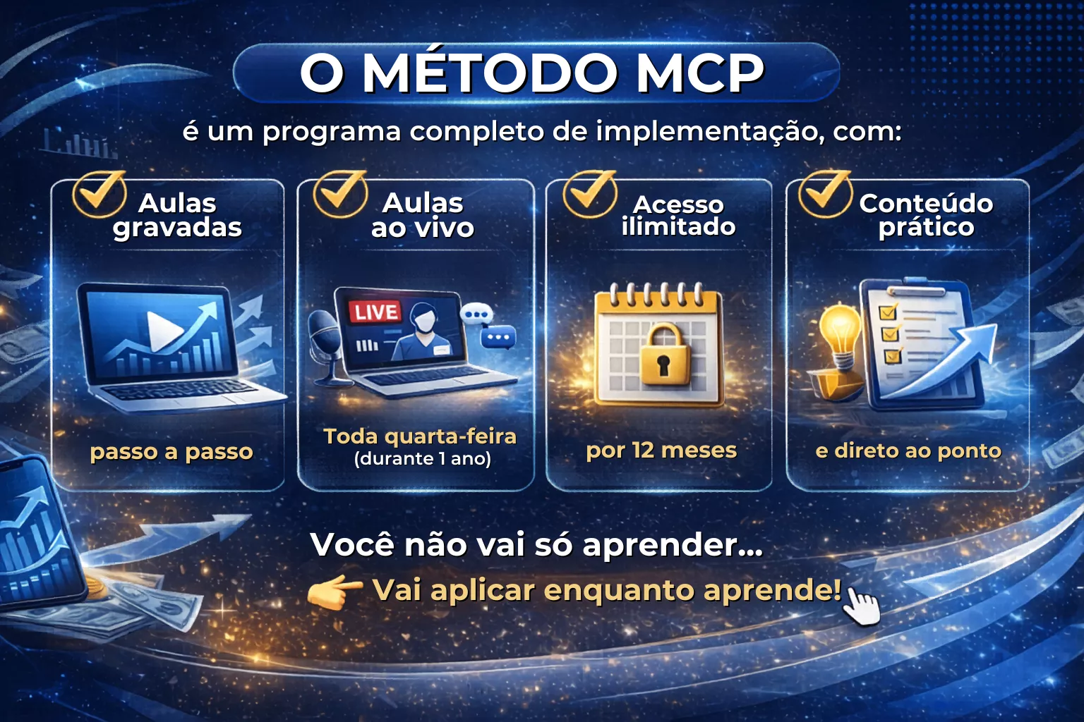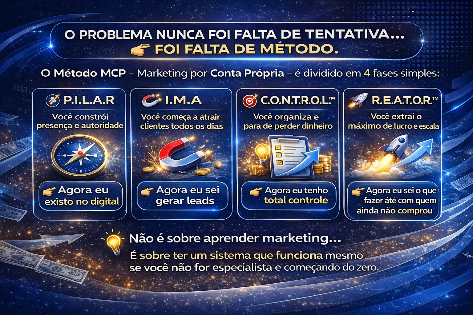 acesso às aulas, liberação de conteúdo, problemas para assistir vídeos ou qualquer dificuldade com o ambiente virtual de aprendizagem. Ou seja, você não ficará travado por questões técnicas. O Método MCP foi construído para ser autoexplicativo, direto e aplicável, sem depender de alguém ao seu lado o tempo todo. Você aprende o processo, entende o jogo e ganha autonomia. O objetivo é te ensinar a caminhar com as próprias pernas e dominar o seu marketing de verdade, sem depender de acompanhamento constante ou de terceiros para cuidar do seu marketing.