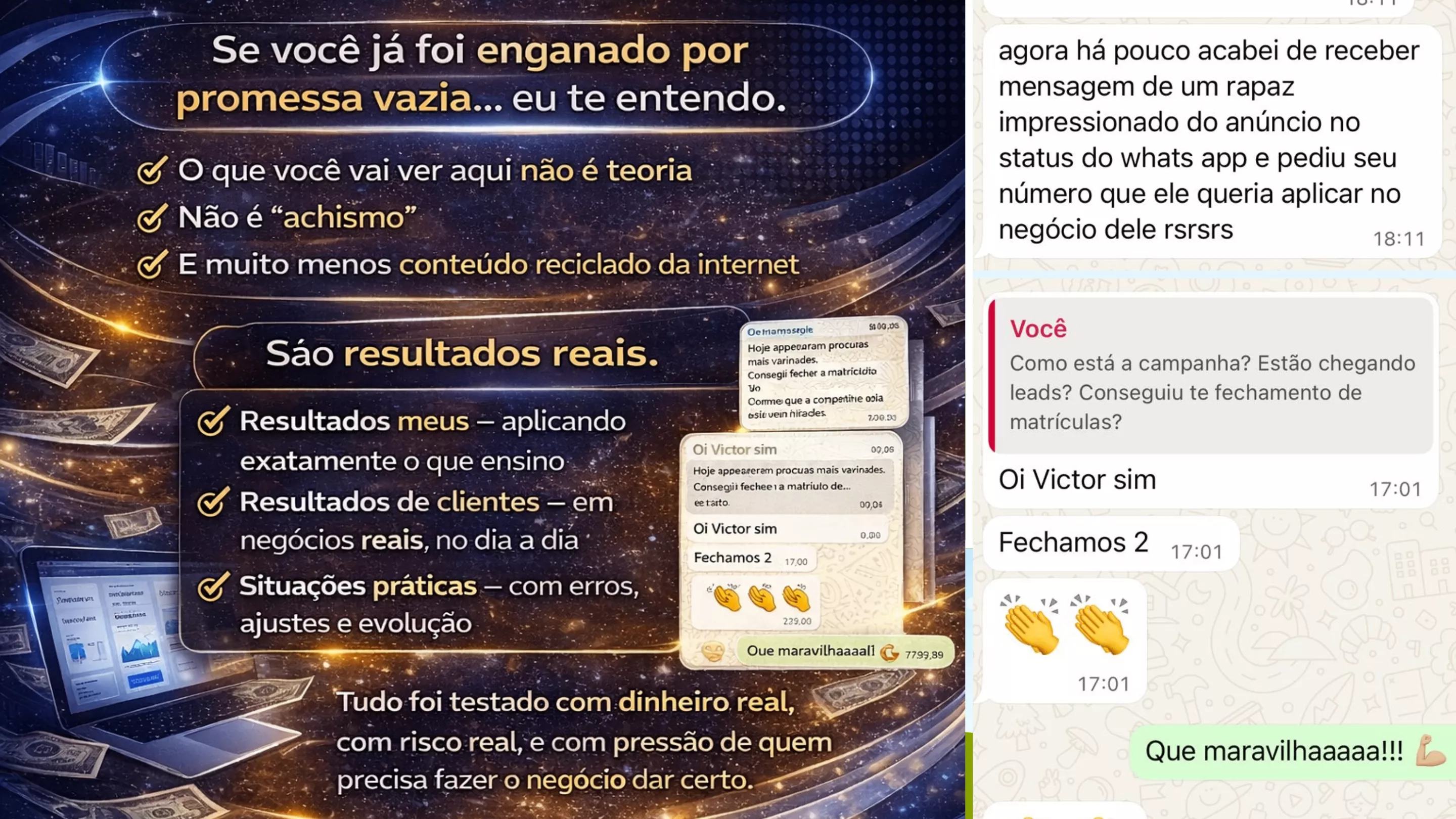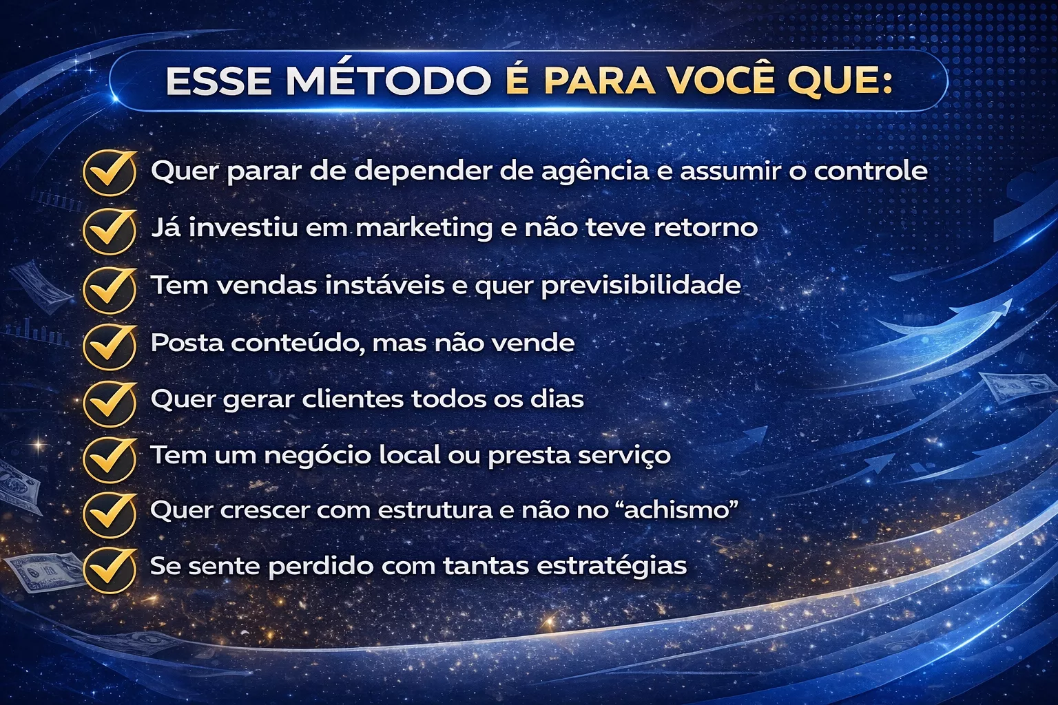 Se o seu negócio precisa de clientes, então sim, funciona. O método não é baseado em “nichos”, mas em princípios universais de aquisição e venda. Ele já se aplica a negócios locais, prestadores de serviço e pequenos empresários. Você adapta a estratégia para a sua realidade, e não o contrário. O que muda não é o método, é a forma de aplicar.