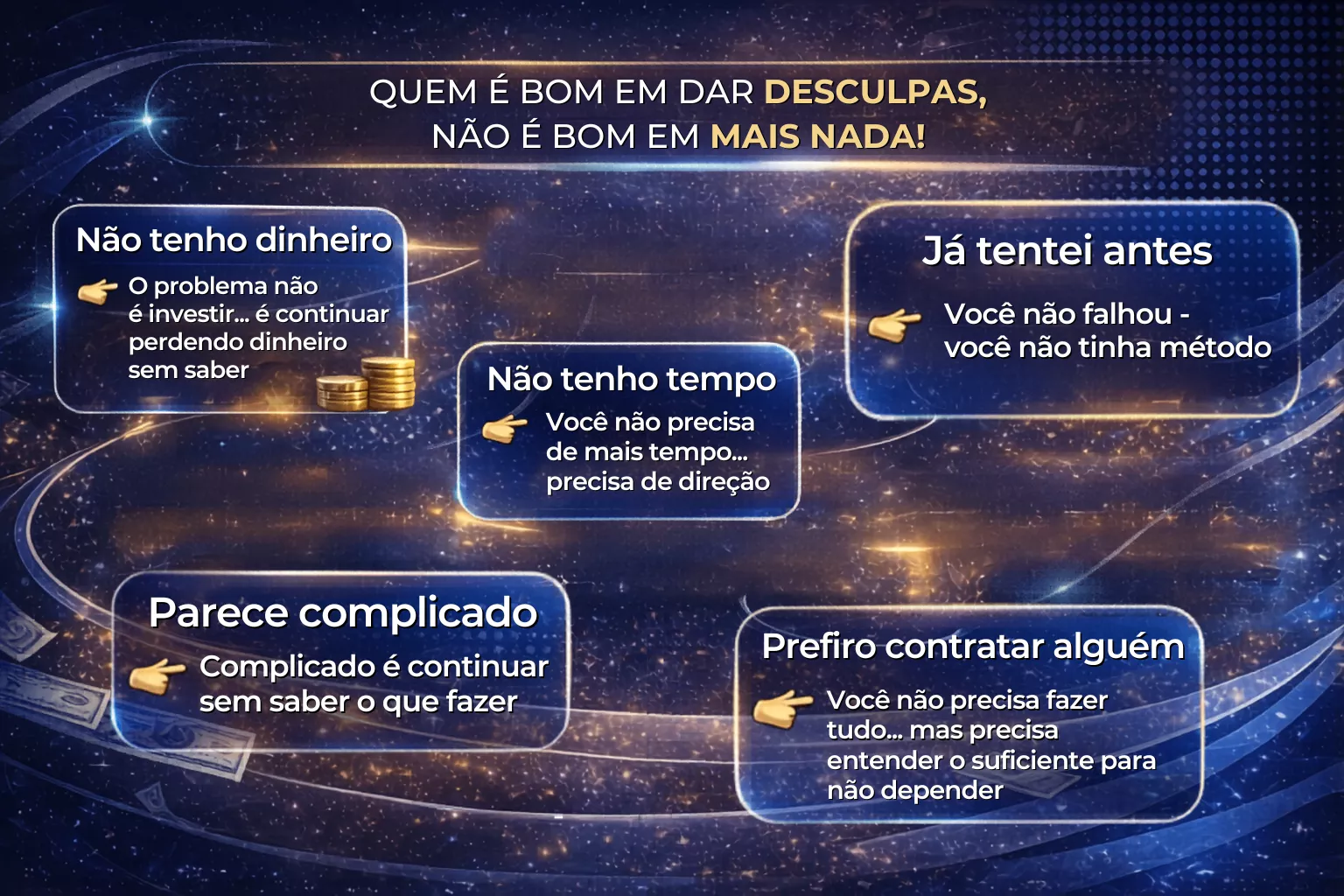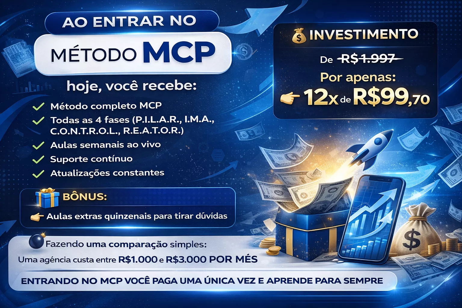 A pergunta certa não é “quanto investir”… é “como investir sem perder dinheiro”. Muitos começam com valores altos sem entender o básico, e por isso se frustram. No MCP, você aprende a começar com segurança, validar e escalar com consciência. Mesmo com pouco investimento já é possível gerar resultado se a estrutura estiver correta. O foco não é gastar mais, mas sim, fazer cada real trabalhar a seu favor. Quando o resultado vem, vale a pena investir cada vez mais.